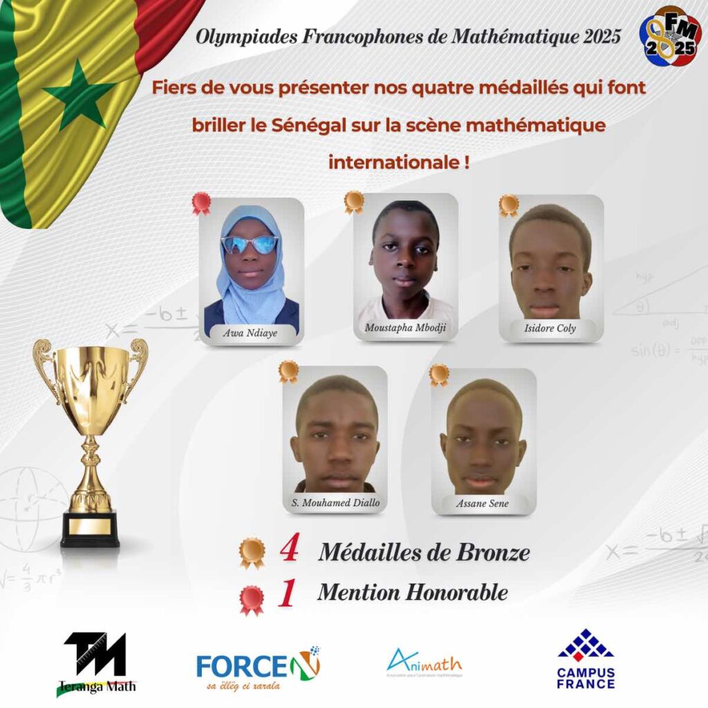 Le Sénégal a remporté quatre médailles de bronze et une mention honorable lors de la 6ᵉ édition de la grande compétition internationale des Olympiades Francophones de Mathématiques 2025. Cette performance exceptionnelle, qui survient seulement un an après la première participation du pays en 2024, est le résultat du dévouement et de l’engagement de l’association TerangaMath, en partenariat avec FORCE-N et Animath.